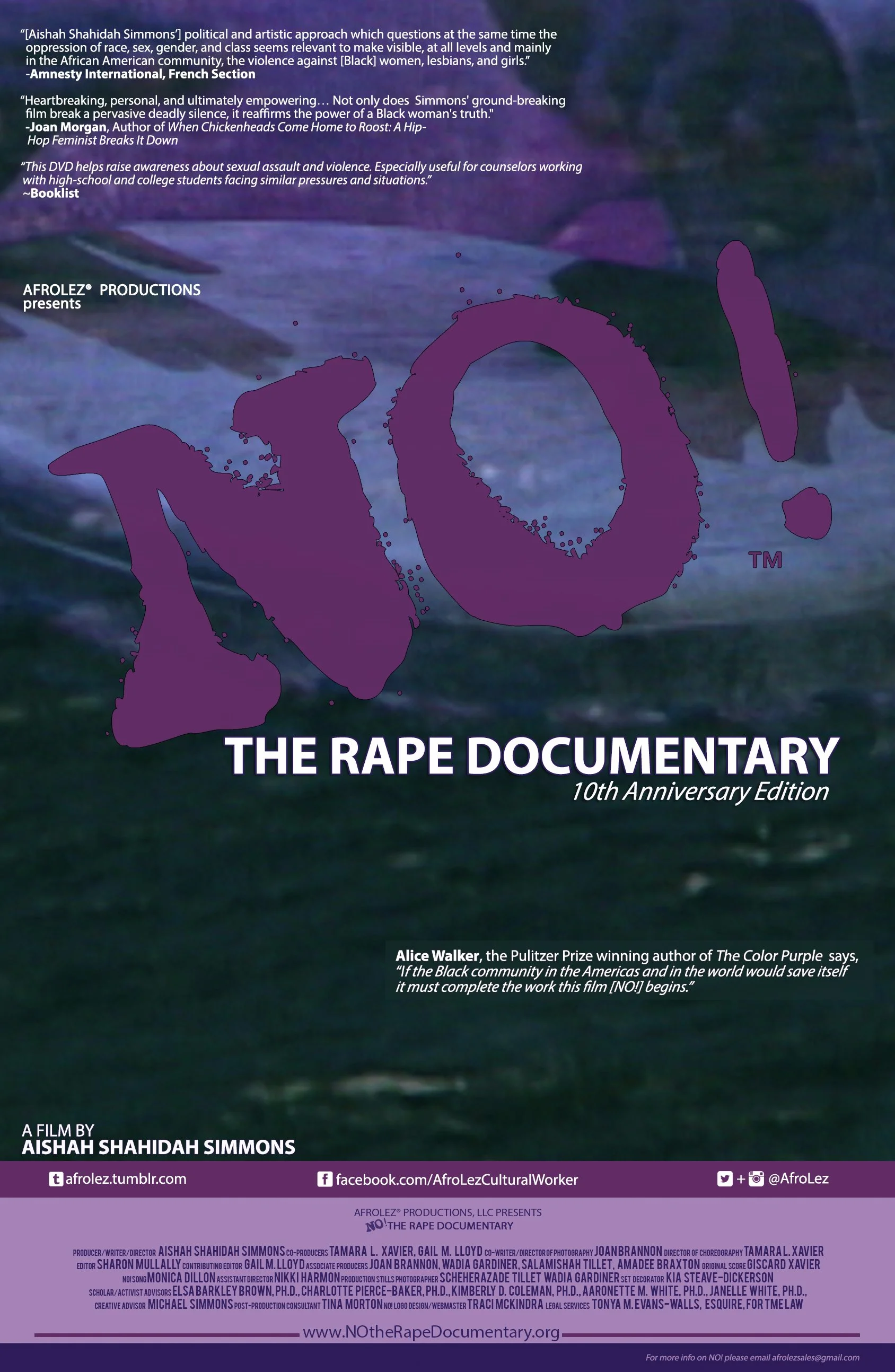 "It is not an exaggeration to say that Aishah Shahidah Simmons's groundbreaking film NO! The Rape Documentary saved my life. The ceremony of this film, and the brave generosity of the survivors who shared their stories showed me how to love a part of myself I would have otherwise tried to throw away. The blessing of watching this film taught me that my survival is powerful and necessary, a divine imperative to transform the world. I believe that EVERYone who loves anyone, anyone who believes in change, anyone who believes a more loving world is possible should watch and study and share and gather around this crucial film."